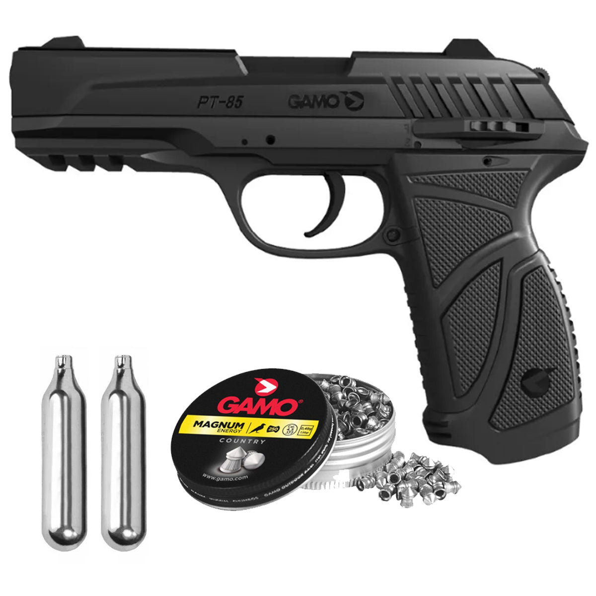 PISTOLA DE CO2 A BALINES METALICOS GAMO PT85 CAL 4,5MM + 2 CO2 + 250 POSTONES